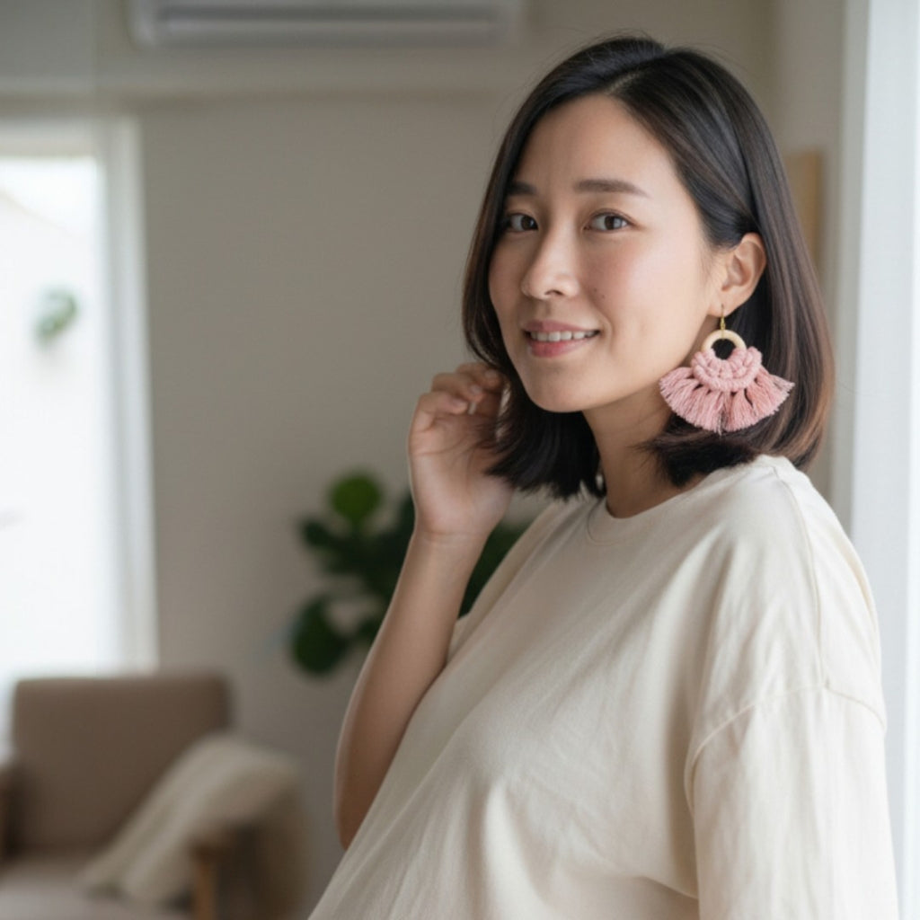| 商品名 | マクラメ ピアス ウッドリング Pink |
