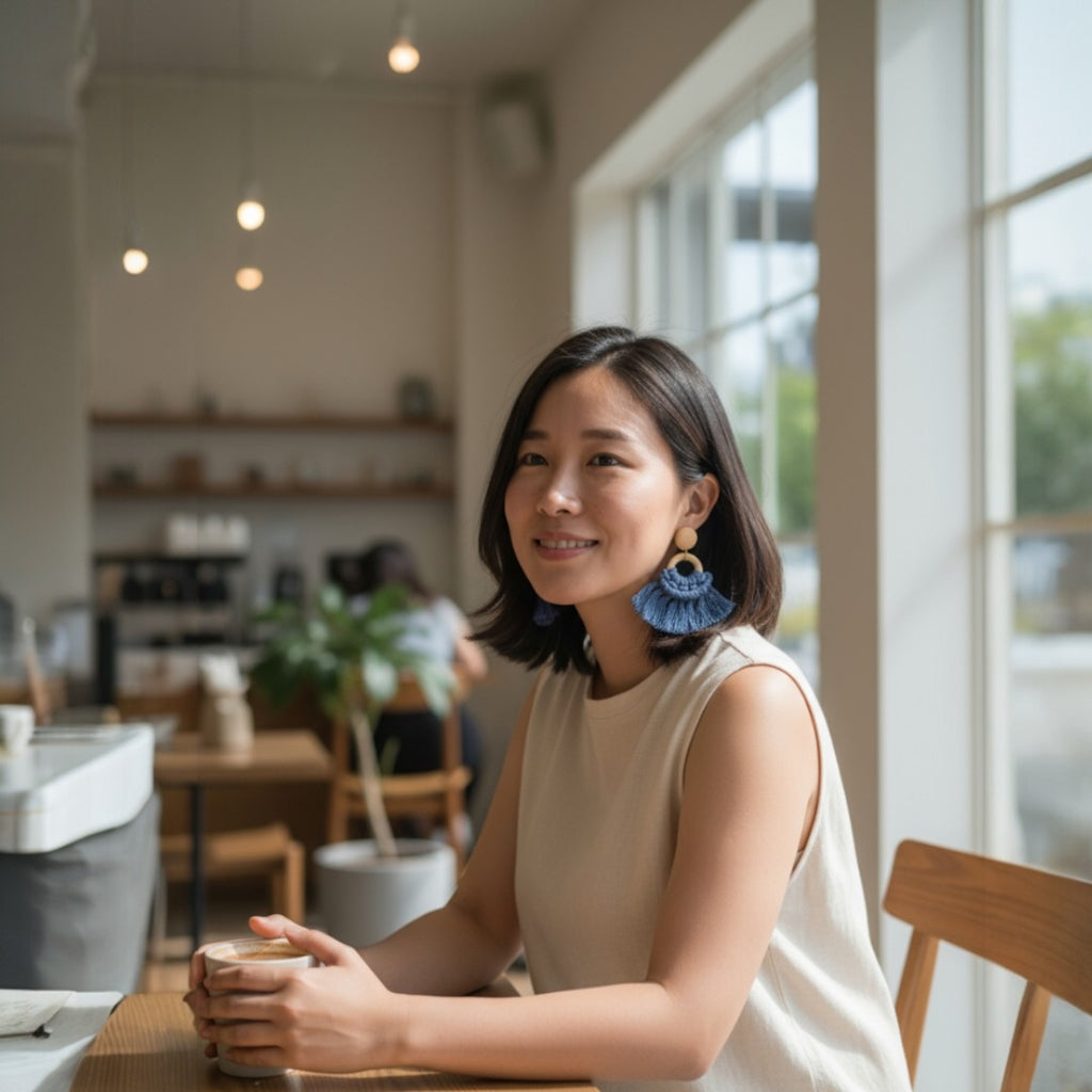 マクラメ ピアス ウッドリング Indigo Blue